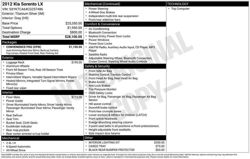 Kia Sorento LX 2012 Titanium Silver Newly Detailed, AWD, 3.91 Axle Ratio, 4-Wheel Disc Brakes, 6 Speakers, 7.0 x 17 Alloy Wheels, ABS brakes, Air Conditioning, Alloy wheels, AM/FM radio: SiriusXM, AM/FM/CD/MP3 Radio, Anti-whiplash front head restraints, Auto Dimming Mirror w/Backup Camera Display, Backup Warning System, Black Cross Bars, Black Rear Bumper Protector, Brake assist, Bumpers: body-color, Cargo Tray, Carpet Floor Mats (5 Seat), CD player, Convenience Package, Delay-off headlights, Driver door bin, Driver vanity mirror, Dual front impact airbags, Dual front side impact airbags, Electronic Stability Control, Fog Lamps, Four wheel independent suspension, Front anti-roll bar, Front Bucket Seats, Front Center Armrest, Front reading lights, Heated door mirrors, Heated Front Seats, Illuminated entry, Interior Lighting Kit, Low tire pressure warning, Occupant sensing airbag, Overhead airbag, Overhead console, Panic alarm, Passenger door bin, Passenger vanity mirror, Power door mirrors, Power steering, Power windows, Rear anti-roll bar, Rear seat center armrest, Rear window defroster, Rear window wiper, Remote keyless entry, Roof Rails, Speed control, Split folding rear seat, Steering wheel mounted audio controls, Tachometer, Telescoping steering wheel, Tilt steering wheel, Traction control, Tricot Fabric Seat Trim, Trip computer, Turn signal indicator mirrors, Variably intermittent wipers, AWD.