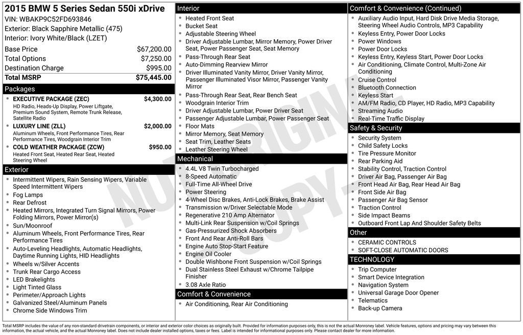 BMW 5 Series 550i xDrive 2015 Black Sapphire Metallic Newly Detailed, AWD, Ivory White/Black Leather, 10 Speakers, 4-Wheel Disc Brakes, ABS brakes, Air Conditioning, Alloy wheels, AM/FM radio, Anthracite Wood Trim, Anti-Theft AM/FM/CD Audio System, Anti-whiplash front head restraints, Auto tilt-away steering wheel, Auto-dimming door mirrors, Auto-dimming Rear-View mirror, Automatic temperature control, Brake assist, Bumpers: body-color, CD player, Ceramic Controls, Dakota Leather Upholstery, Delay-off headlights, Driver door bin, Driver vanity mirror, Dual front impact airbags, Dual front side impact airbags, Electronic Stability Control, Emergency communication system, Exterior Parking Camera Rear, Four wheel independent suspension, Front anti-roll bar, Front Bucket Seats, Front Center Armrest, Front dual zone A/C, Front fog lights, Front reading lights, Fully automatic headlights, Garage door transmitter, Genuine wood console insert, Genuine wood dashboard insert, Genuine wood door panel insert, Harman Kardon Surround Sound System, Head restraints memory, Head-Up Display, Heated door mirrors, Heated Front Seats, Heated Rear Seats, Heated Steering Wheel, High intensity discharge headlights: Bi-xenon, Illuminated entry, Instrument Cluster w/Extended Contents, Leather Dashboard, Leather Shift Knob, Leather steering wheel, Low tire pressure warning, Memory seat, Multi-Contour Seats, Navigation System, Occupant sensing airbag, Outside temperature display, Overhead airbag, Panic alarm, Passenger door bin, Passenger vanity mirror, Power adjustable front head restraints, Power door mirrors, Power driver seat, Power moonroof, Power passenger seat, Power steering, Power Tailgate, Power windows, Radio data system, Rain sensing wipers, Rear air conditioning, Rear anti-roll bar, Rear reading lights, Rear seat center armrest, Rear window defroster, Remote keyless entry, Retractable Headlight Washers, Satellite Radio, Security system, Soft-Close Automatic Doors, Speed control, Speed-sensing steering, Speed-Sensitive Wipers, Split folding rear seat, Sport Leather Steering Wheel, Sport steering wheel, Steering wheel memory, Steering wheel mounted A/C controls, Steering wheel mounted audio controls, Tachometer, Telescoping steering wheel, Tilt steering wheel, Traction control, Trip computer, Turn signal indicator mirrors, Variably intermittent wipers, Wheels: 18 x 8.0 Light Alloy V-Spoke (Style 328), Wheels: 19 x 8.5 Multi Spoke Lt Ally (Style 455), Without Lines Designation Outside, AWD, Ivory White/Black Leather.