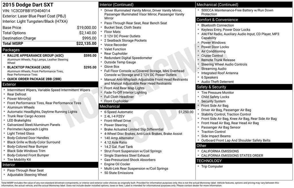 Dodge Dart SXT 2015 Laser Blue Pearl Coat Newly Detailed, 4-Wheel Disc Brakes, 6 Speakers, ABS brakes, Active Grille Shutters, Air Conditioning, Alloy wheels, AM/FM radio, Anti-whiplash front head restraints, Black Crosshair w/Black Surround, Black Fog Lamp Spear & Bezel, Blacktop Package, Brake assist, Bumpers: body-color, CD player, Delay-off headlights, Driver door bin, Driver vanity mirror, Dual front impact airbags, Dual front side impact airbags, Dual Rear Exhaust w/Bright Tips, Electronic Stability Control, Fog Lamps, Four wheel independent suspension, Front anti-roll bar, Front Bucket Seats, Front Center Armrest, Front reading lights, Fully automatic headlights, Gloss Black Exterior Mirrors, Illuminated entry, Knee airbag, Leather Wrapped Steering Wheel, Low tire pressure warning, Occupant sensing airbag, Outside temperature display, Overhead airbag, Overhead console, Panic alarm, Passenger door bin, Passenger vanity mirror, Power door mirrors, Power steering, Power windows, Premium Cloth Seats, Quick Order Package 2BB, Radio data system, Radio: Uconnect 200 AM/FM/CD/MP3, RALLYE Appearance Group, RALLYE Badge, RALLYE Group, Rear reading lights, Rear seat center armrest, Rear side impact airbag, Rear Stabilizer Bar, Rear window defroster, Remote keyless entry, Security system, Speed control, Speed-sensing steering, Speed-Sensitive Wipers, Split folding rear seat, Steering wheel mounted audio controls, Tachometer, Telescoping steering wheel, Tilt steering wheel, Touring Suspension, Traction control, Trip computer, Underbody Aerodynamic Treatment, Variably intermittent wipers, Wheels: 16 x 7.0 Monotone Painted Aluminum, Wheels: 17 x 7.5 Granite Crystal Aluminum, Wheels: 18 x 7.5 Gloss Black Aluminum.