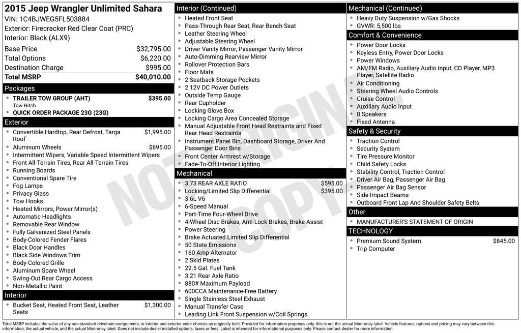 Jeep Wrangler Unlimited Sahara 2015 Firecracker Red Clear Coat Newly Detailed, 18 x 7.5 7-Spoke Polished Aluminum Wheels, 18 x 7.5 Polished Satin Carbon Wheels, 4-Wheel Disc Brakes, 8 Speakers, ABS brakes, Air Conditioning, Alloy wheels, Alpine 9-Speaker w/All Weather Subwoofer, AM/FM radio, Anti-Spin Differential Rear Axle, Audio Jack Input for Mobile Devices, Auto-dimming Rear-View mirror, Brake assist, CD player, Class II Receiver Hitch, Cloth Bucket Seats, Compass, Driver door bin, Driver vanity mirror, Dual front impact airbags, Electronic Stability Control, Front anti-roll bar, Front Bucket Seats, Front Center Armrest w/Storage, Front fog lights, Front reading lights, Fully automatic headlights, Heated door mirrors, Heated Front Seats, Heavy Duty Suspension w/Gas Shocks, Illuminated entry, Integrated roll-over protection, Leather steering wheel, Leather Wrapped Steering Wheel, Low tire pressure warning, Manufacturer's Statement of Origin, Occupant sensing airbag, Outside temperature display, Panic alarm, Passenger door bin, Passenger vanity mirror, Power door mirrors, Power steering, Power windows, Quick Order Package 23G, Radio data system, Radio: Uconnect 130 AM/FM/CD/MP3, Rear anti-roll bar, Remote keyless entry, Security system, Speed control, Split folding rear seat, Steering wheel mounted audio controls, Tachometer, Tilt steering wheel, Traction control, Trailer Tow Group, Trailer Tow w/4-Pin Connector Wiring, Trip computer, Variably intermittent wipers.