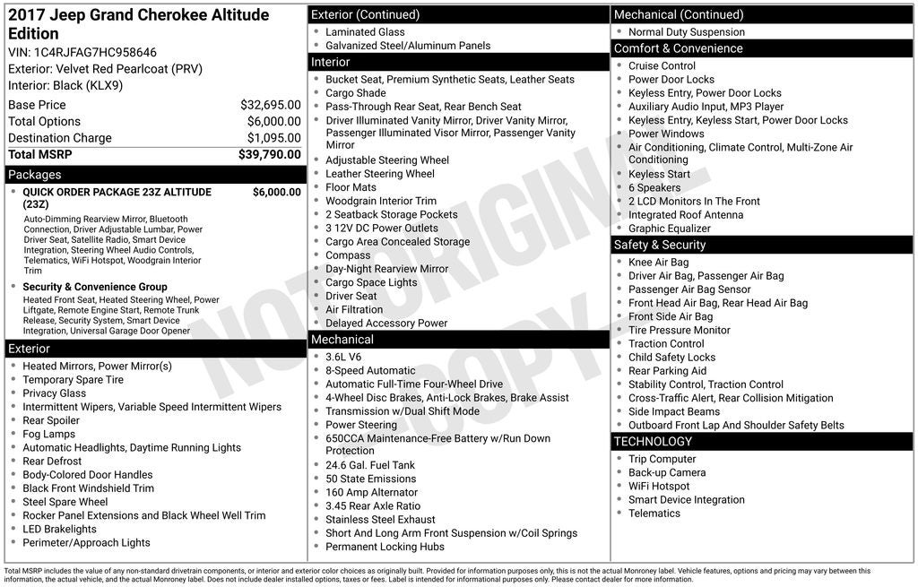 Jeep Grand Cherokee Altitude 2017 Velvet Red Pearlcoat Newly Detailed, 4WD, 1-Year SiriusXM Radio Service, 115V Auxiliary Power Outlet, 17 x 8.0 Aluminum Wheels, 3.45 Rear Axle Ratio, 4-Wheel Disc Brakes, 6 Month Trial (Registration Required), 6 Speakers, 8.4 Touchscreen Display, ABS brakes, Air Conditioning, Alloy wheels, Altitude Grille, Altitude IV Package, AM/FM radio, Anodized Gun Metal Interior Accents, Anti-whiplash front head restraints, Auto-Dimming Rear-View Mirror, Automatic temperature control, Black Suede Seats w/Black Stitching (DISC), Body Color Claddings, Body Color Fascia, Body Color Shark Fin Antenna, Brake assist, Bumpers: body-color, Cloth Low-Back Bucket Seats, Compass, Dark Day Light Opening Moldings, Dark Headlamp Bezel Finish, Dark Lens Taillamps, Delay-off headlights, Delete Laredo Badge, Driver door bin, Driver vanity mirror, Dual front impact airbags, Dual front side impact airbags, Electronic Stability Control, For Details Visit DriveUconnect.com, For More Info, Call 800-643-2112, Four wheel independent suspension, Front Accent/Body Color Fascia, Front anti-roll bar, Front Bucket Seats, Front Center Armrest w/Storage, Front dual zone A/C, Front fog lights, Front reading lights, Fully automatic headlights, Gloss Black Fascia Applique, Heated door mirrors, Illuminated entry, Instrument Cluster w/Off-Road Disp. Pages, Jeep Black Gloss Badging, Knee airbag, Leather Shift Knob, Low tire pressure warning, Normal Duty Suspension, Occupant sensing airbag, Outside temperature display, Overhead airbag, Overhead console, Panic alarm, ParkView Rear Back-Up Camera, Passenger door bin, Passenger vanity mirror, Power 4-Way Driver Lumbar Adjust, Power 8-Way Driver/Manual Passenger Seat, Power door mirrors, Power Liftgate, Power steering, Power windows, Quick Order Package 23Z Altitude (DISC), Radio data system, Radio: Uconnect 3 w/5 Display, Radio: Uconnect 3C w/8.4 Display, Rear Accent/Body Color Fascia, Rear anti-roll bar, Rear Fascia Gloss Black Step Pad, Rear reading lights, Rear seat center armrest, Rear window defroster, Rear window wiper, Remote keyless entry, Roadside Assistance & 9-1-1 Call, Security & Convenience Group, Security Alarm, Single Exhaust w/Bright Tip, SiriusXM Satellite Radio, Speed control, Speed-Sensitive Wipers, Split folding rear seat, Spoiler, Steering Wheel Mounted Audio Controls, Steering wheel mounted audio controls, Tachometer, Telescoping steering wheel, Tilt steering wheel, Traction control, Trip computer, Uconnect Access, Universal Garage Door Opener, Variably intermittent wipers, Wheels: 20 x 8.0 Gloss Black Aluminum (DISC), 4WD.