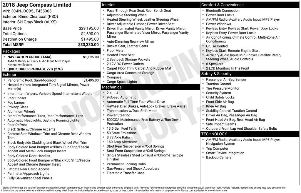 Jeep Compass Limited 2018 Rhino Clearcoat Newly Detailed, 4WD, 3.73 Axle Ratio, 4-Wheel Disc Brakes, 6 Speakers, ABS brakes, Air Conditioning, Alloy wheels, AM/FM radio: SiriusXM, Anti-whiplash front head restraints, Apple CarPlay/Android Auto, Auto-dimming Rear-View mirror, Automatic temperature control, Brake assist, Bumpers: body-color, Compass, Delay-off headlights, Driver door bin, Driver vanity mirror, Dual front impact airbags, Dual front side impact airbags, Electronic Stability Control, Four wheel independent suspension, Front anti-roll bar, Front Bucket Seats, Front Center Armrest w/Storage, Front dual zone A/C, Front fog lights, Front reading lights, Fully automatic headlights, GPS Navigation, Heated door mirrors, Heated front seats, Heated steering wheel, Illuminated entry, Knee airbag, Leather Shift Knob, Leather Trimmed Bucket Seats, Low tire pressure warning, Navigation Group, Occupant sensing airbag, Outside temperature display, Overhead airbag, Overhead console, Panic alarm, ParkView Rear Back-Up Camera, Passenger door bin, Passenger vanity mirror, Power door mirrors, Power driver seat, Power Front/Fixed Rear Full Sunroof, Power steering, Power windows, Quick Order Package 27G, Radio: Uconnect 4 w/8.4 Display, Radio: Uconnect 4C Nav w/8.4 Display, Rear anti-roll bar, Rear seat center armrest, Rear window defroster, Rear window wiper, Remote keyless entry, Roof rack: rails only, Security system, Speed control, Split folding rear seat, Spoiler, Steering wheel mounted audio controls, Tachometer, Telescoping steering wheel, Tilt steering wheel, Traction control, Trip computer, Turn signal indicator mirrors, Variably intermittent wipers, Wheels: 18 x 7.0 Polished/Gray Pockets Aluminum, 4WD. Priced below KBB Fair Purchase Price!