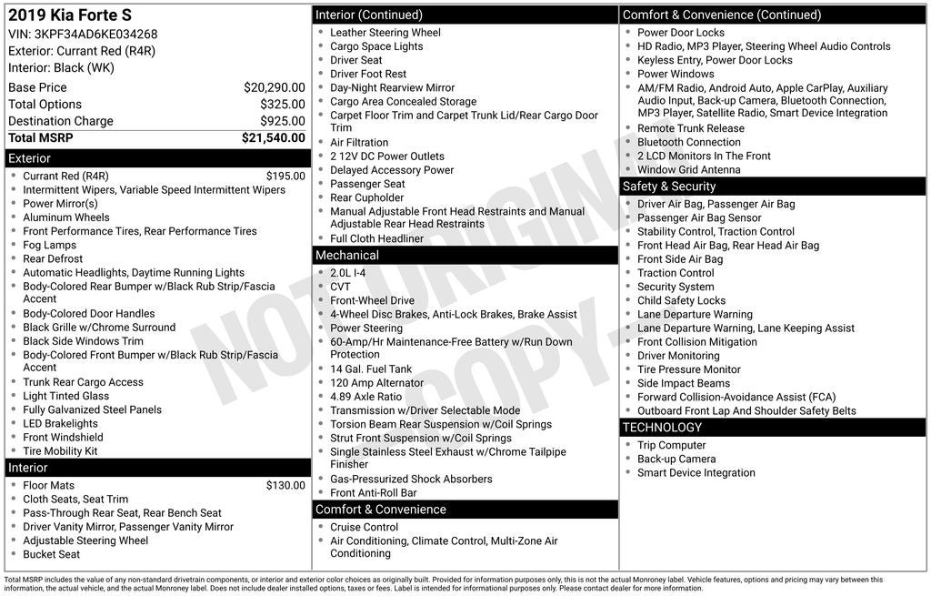 Kia Forte S 2019 Currant Red Newly Detailed, 4-Wheel Disc Brakes, 6 Speakers, ABS brakes, Air Conditioning, Alloy wheels, AM/FM radio: SiriusXM, Apple CarPlay & Android Auto, Automatic temperature control, Brake assist, Bumpers: body-color, Carpeted Floor Mats, Delay-off headlights, Driver door bin, Driver vanity mirror, Dual front impact airbags, Dual front side impact airbags, Electronic Stability Control, Exterior Parking Camera Rear, Front anti-roll bar, Front Bucket Seats, Front Center Armrest, Front dual zone A/C, Front fog lights, Front reading lights, Front wheel independent suspension, Fully automatic headlights, Illuminated entry, Low tire pressure warning, Occupant sensing airbag, Overhead airbag, Overhead console, Panic alarm, Passenger door bin, Passenger vanity mirror, Power door mirrors, Power steering, Power windows, Radio data system, Radio: UVO eServices AM/FM/MP3 Audio System, Rear seat center armrest, Rear window defroster, Remote keyless entry, Security system, Speed control, Split folding rear seat, Steering wheel mounted audio controls, Tachometer, Telescoping steering wheel, Tilt steering wheel, Traction control, Tricot Cloth Seat Trim, Trip computer, Variably intermittent wipers, Wheels: 17 x 7.0 Machine Finish Alloy.