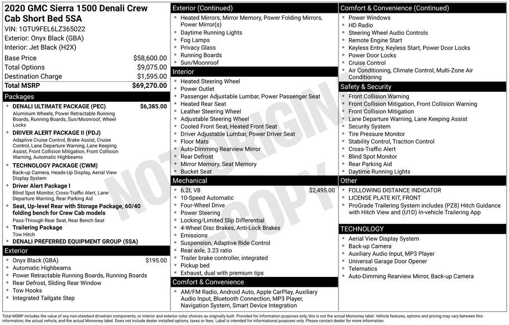 GMC Sierra 1500 Denali 2020 Onyx Black Newly Detailed, 10-Speed Automatic, 4WD, Black Leather, 10-Way Power Driver Seat Adjuster w/Lumbar, 10-Way Power Passenger Seat Adjuster w/Lumbar, 12-Volt Rear Auxiliary Power Outlet, 120-Volt Bed Mounted Power Outlet, 120-Volt Instrument Panel Power Outlet, 170 Amp Alternator, 2 USB Ports, 2 USB Ports (1st Row), 3.23 Rear Axle Ratio, 4-Wheel Disc Brakes, 4G LTE Wi-Fi Hotspot Capable, 7 Speakers, ABS brakes, Adaptive Cruise Control - Camera, Adaptive Ride Control Suspension, Adaptive suspension, Air Conditioning, Alloy wheels, AM/FM radio: SiriusXM with 360L, Apple CarPlay/Android Auto, Auto-dimming door mirrors, Auto-dimming Rear-View mirror, Automatic Emergency Braking, Automatic temperature control, Auxiliary External Transmission Oil Cooler, Bed View Camera, Brake assist, Bumpers: body-color, Chrome Recovery Hooks, Chrome Wheel To Wheel Assist Steps, Color-Keyed Carpeting Floor Covering, Compass, Deep-Tinted Glass, Delay-off headlights, Denali Ultimate Package, Driver Alert Package I, Driver Alert Package II, Driver door bin, Driver Memory, Driver vanity mirror, Dual front impact airbags, Dual front side impact airbags, Electric Rear-Window Defogger, Electrical Lock Control Steering Column, Electronic Stability Control, Floor-Mounted Center Console, Following Distance Indicator, Forge Perforated Leather-Appointed Seat Trim, Forward Collision Alert, Front anti-roll bar, Front Bucket Seats, Front Center Armrest, Front dual zone A/C, Front fog lights, Front License Plate Kit, Front Pedestrian Braking, Front reading lights, Front wheel independent suspension, Fully automatic headlights, Garage door transmitter, Genuine wood console insert, Genuine wood door panel insert, GMC Connected Access Capable, GMC MultiPro Power Steps (DISC), HD Radio, HD Rear Vision Camera, HD Surround Vision w/2 Trailer View Camera Provisions, Heated 2nd Row Outboard Seats, Heated door mirrors, Heated Driver & Front Outboard Passenger Seating, Heated front seats, Heated rear seats, Heated steering wheel, Heavy-Duty Rear Locking Differential, High-Capacity Air Filter, Hill Descent Control, Hitch Guidance, Hitch Guidance w/Hitch View, Illuminated entry, In-Vehicle Trailering App, Integrated Trailer Brake Controller, IntelliBeam Automatic High Beam On/Off, Keyless Open & Start, Lane Change Alert w/Side Blind Zone Alert, Lane Keep Assist w/Lane Departure Warning, LED Cargo Area Lighting, Low tire pressure warning, Manual Tilt-Wheel & Telescoping Steering Column, Memory seat, Multicolor 15 Diagonal Head-Up Display, Navigation System, Occupant sensing airbag, OnStar & GMC Connected Services Capable, Outside temperature display, Overhead airbag, Overhead console, Panic alarm, Passenger door bin, Passenger vanity mirror, Power Door Locks, Power door mirrors, Power driver seat, Power Front Passenger Windows w/Express Up/Down, Power Front Windows w/Driver Express Up/Down, Power passenger seat, Power Rear Windows w/Express Down, Power Sliding Rear Window w/Rear Defogger, Power steering, Power Sunroof, Power windows, Preferred Equipment Group 5SA, Premium audio system: GMC Infotainment System, Premium Bose 7-Speaker Sound System, ProGrade Trailering System, Radio data system, Radio: Premium GMC Infotainment Sys w/Navigation, Rear Camera Mirror, Rear Cross Traffic Alert, Rear Dual USB Charging-Only Ports, Rear reading lights, Rear seat center armrest, Rear step bumper, Rear Wheelhouse Liners, Rear window defroster, Remote keyless entry, Remote Vehicle Starter System, Safety Alert Seat, Security system, Signature Denali Grille, SiriusXM w/360L, Speed control, Speed-sensing steering, Split folding rear seat, Spray-On Pickup Bed Liner w/Denali Logo, Steering Wheel Audio Controls, Steering wheel mounted audio controls, Tachometer, Technology Package, Telescoping steering wheel, Theft Deterrent System (Unauthorized Entry), Tilt steering wheel, Traction control, Trailering Package, Trip computer, Ultrasonic Front & Rear Park Assis