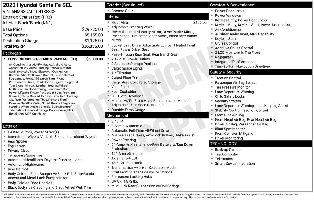 Hyundai Santa Fe SEL 2020 Scarlet Red Newly Detailed, AWD, Black/Black Leather, 17 x 7.0J Alloy Wheels, 18 x 7.5J Alloy Wheels, 4-Wheel Disc Brakes, 6 Speakers, 8-Way Power Adjustable Passenger Seat, ABS brakes, Acoustic-Laminated Front Side Windows, Air Conditioning, Alloy wheels, AM/FM radio: SiriusXM, Apple CarPlay & Android Auto, Auto High-beam Headlights, Auto-Dimming Inside Rear-View Mirror, Axle Ratio 4.081, Brake assist, Bumpers: body-color, Carpeted Floor Mats, Convenience + Premium Package, Delay-off headlights, Driver door bin, Driver vanity mirror, Dual Automatic Temperature Control, Dual front impact airbags, Dual front side impact airbags, Electronic Stability Control, Emergency communication system, Exterior Parking Camera Rear, Four wheel independent suspension, Front anti-roll bar, Front Bucket Seats, Front Center Armrest, Front fog lights, Front reading lights, Fully automatic headlights, Hands-Free Smart Liftgate w/Auto Open, Heated door mirrors, Heated Front Bucket Seats, Heated front seats, Illuminated entry, Leather Seating Surfaces, Leather Wrapped Steering Wheel & Shift Knob, LED Fog Lights, LED Headlights, LED Interior Lights, LED Taillights, Low tire pressure warning, Manual Rear Side Sunshades, Occupant sensing airbag, Outside temperature display, Overhead airbag, Overhead console, Panic alarm, Panoramic Sunroof, Parking Distance Warning-Reverse, Passenger door bin, Passenger vanity mirror, Power door mirrors, Power driver seat, Power steering, Power windows, Radio: AM/FM/MP3 Display Audio, Radio: Infinity Premium AM/FM/MP3 Display Audio, Rear anti-roll bar, Rear seat center armrest, Rear window defroster, Rear window wiper, Remote keyless entry, Roof Side Rails, Satin Chrome Exterior Door Handles, Security system, Side Mirrors w/Turn Signal Indicators, Speed control, Speed-sensing steering, Split folding rear seat, Spoiler, Stain-Resistant Cloth Seating Surfaces, Steering wheel mounted audio controls, Tachometer, Telescoping steering wheel, Tilt steering wheel, Traction control, Trip computer, Ultrasonic Rear Occupant Alert, Variably intermittent wipers, AWD, Black/Black Leather.