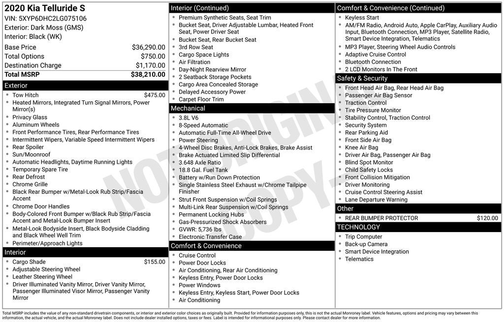 Kia Telluride S 2020 Dark Moss Newly Detailed, 3.648 Axle Ratio, 3rd row seats: split-bench, 4-Wheel Disc Brakes, 6 Speakers, ABS brakes, Air Conditioning, Alloy wheels, AM/FM radio: SiriusXM, Apple CarPlay & Android Auto, Brake assist, Bumpers: body-color, Cargo Cover, Delay-off headlights, Driver door bin, Driver vanity mirror, Dual front impact airbags, Dual front side impact airbags, Electronic Stability Control, Emergency communication system: 911 Connect, Four wheel independent suspension, Front anti-roll bar, Front Bucket Seats, Front Center Armrest, Front reading lights, Fully automatic headlights, Heated door mirrors, Heated Front Bucket Seats, Heated front seats, Illuminated entry, Knee airbag, Leather Shift Knob, Leather steering wheel, Low tire pressure warning, Occupant sensing airbag, Outside temperature display, Overhead airbag, Overhead console, Panic alarm, Passenger door bin, Passenger vanity mirror, Power door mirrors, Power driver seat, Power moonroof, Power steering, Power windows, Radio data system, Radio: AM/FM/MP3/SiriusXM Audio System, Rear air conditioning, Rear anti-roll bar, Rear Bumper Protector, Rear reading lights, Rear window defroster, Rear window wiper, Reclining 3rd row seat, Remote keyless entry, Roof rack: rails only, Security system, SOFINO Artificial Leather Upholstery, Speed control, Speed-sensing steering, Split folding rear seat, Spoiler, Steering wheel mounted audio controls, Tachometer, Telescoping steering wheel, Tilt steering wheel, Tow Hitch w/Harness, Traction control, Trip computer, Turn signal indicator mirrors, Variably intermittent wipers, Wheels: 7.5 x 20 Machined Finish Alloy.