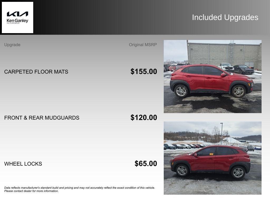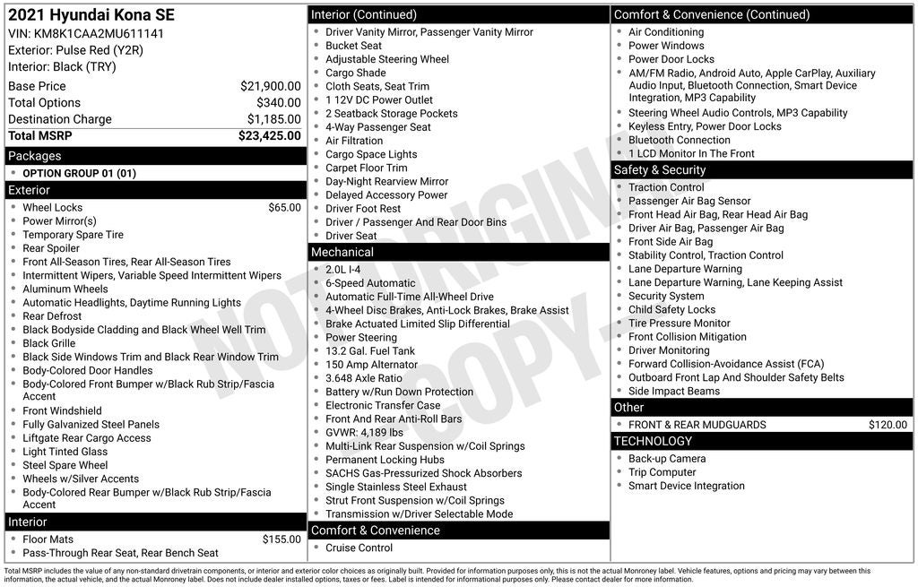 Hyundai Kona SE 2021 Pulse Red Newly Detailed, 3.648 Axle Ratio, 4-Wheel Disc Brakes, 6 Speakers, ABS brakes, Air Conditioning, Alloy wheels, AM/FM radio, Apple CarPlay & Android Auto, Brake assist, Bumpers: body-color, Carpeted Floor Mats, Cloth Seat Trim, Delay-off headlights, Driver door bin, Driver vanity mirror, Dual front impact airbags, Dual front side impact airbags, Electronic Stability Control, Exterior Parking Camera Rear, Four wheel independent suspension, Front & Rear Mudguards, Front anti-roll bar, Front Bucket Seats, Front Center Armrest, Front reading lights, Fully automatic headlights, Illuminated entry, Low tire pressure warning, Occupant sensing airbag, Option Group 01, Overhead airbag, Overhead console, Panic alarm, Passenger door bin, Passenger vanity mirror, Power door mirrors, Power steering, Power windows, Radio: AM/FM/MP3 Audio System, Rear anti-roll bar, Rear seat center armrest, Rear window defroster, Rear window wiper, Remote keyless entry, Security system, Speed control, Speed-sensing steering, Split folding rear seat, Spoiler, Steering wheel mounted audio controls, Tachometer, Telescoping steering wheel, Tilt steering wheel, Traction control, Trip computer, Variably intermittent wipers, Wheel Locks, Wheels: 16 x 6.5J Alloy.