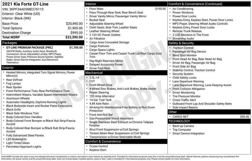 Kia Forte GT-Line 2021 Clear White Newly Detailed, 10-Way Power Driver's Seat, 4-Wheel Disc Brakes, 6 Speakers, ABS brakes, Air Conditioning, Alloy wheels, AM/FM radio, Apple CarPlay & Android Auto, Brake assist, Bumpers: body-color, Cargo Net, Carpeted Floor Mats, Cloth & Leatherette Seat Trim, Delay-off headlights, Driver door bin, Driver vanity mirror, Dual front impact airbags, Dual front side impact airbags, Electronic Stability Control, Exterior Parking Camera Rear, Front anti-roll bar, Front Bucket Seats, Front Center Armrest, Front fog lights, Front reading lights, Front Sport Seats, Front wheel independent suspension, Fully automatic headlights, GT-Line Premium Package, Heated door mirrors, Illuminated entry, Lane Departure Warning System, Leather Shift Knob, Leather steering wheel, Low tire pressure warning, Occupant sensing airbag, Outside temperature display, Overhead airbag, Overhead console, Overhead LED Front & Rear Reading Lamps, Panic alarm, Passenger door bin, Passenger vanity mirror, Power door mirrors, Power steering, Power Sunroof, Power windows, Radio data system, Radio: AM/FM/MP3 Display Audio System, Radio: AM/FM/MP3 harman/kardon Premium Audio System, Rear seat center armrest, Rear window defroster, Remote keyless entry, Security system, Speed control, Split folding rear seat, Spoiler, Steering wheel mounted audio controls, Tachometer, Telescoping steering wheel, Tilt steering wheel, Traction control, Trip computer, Turn signal indicator mirrors, Variably intermittent wipers, Wheels: 17 Graphite Finish Alloy.