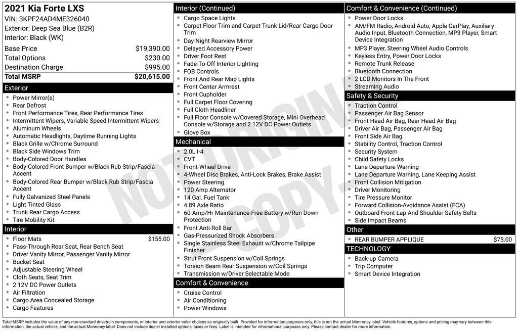 Kia Forte LXS 2021 Deep Sea Blue Newly Detailed, 4 Speakers, 4-Wheel Disc Brakes, ABS brakes, Air Conditioning, Alloy wheels, AM/FM radio, Apple CarPlay & Android Auto, Brake assist, Bumpers: body-color, Carpeted Floor Mats, Delay-off headlights, Driver door bin, Driver vanity mirror, Dual front impact airbags, Dual front side impact airbags, Electronic Stability Control, Exterior Parking Camera Rear, Front anti-roll bar, Front Bucket Seats, Front Center Armrest, Front reading lights, Front wheel independent suspension, Fully automatic headlights, Illuminated entry, Lane Departure Warning System, Low tire pressure warning, Occupant sensing airbag, Outside temperature display, Overhead airbag, Overhead console, Panic alarm, Passenger door bin, Passenger vanity mirror, Power door mirrors, Power steering, Power windows, Radio data system, Radio: AM/FM/MP3 Display Audio System, Rear Bumper Applique, Rear reading lights, Rear window defroster, Remote keyless entry, Security system, Speed control, Split folding rear seat, Steering wheel mounted audio controls, Tachometer, Telescoping steering wheel, Tilt steering wheel, Traction control, Trip computer, Variably intermittent wipers, Wheels: 16 Machine Finish Alloy, Woven Cloth Seat Trim.