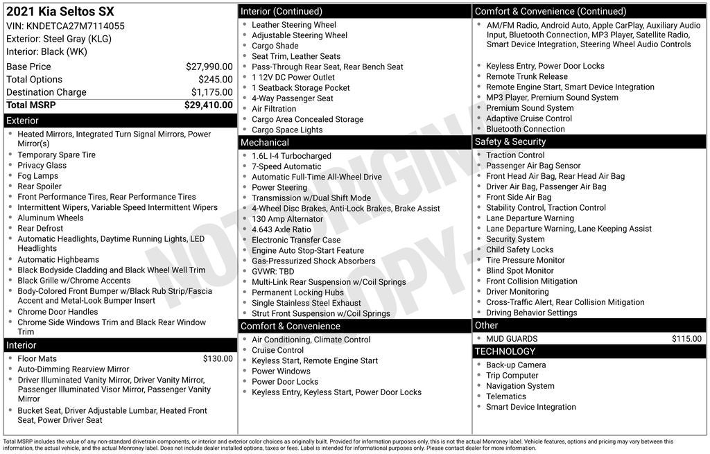Kia Seltos SX 2021 Steel Gray Newly Detailed, 18 Alloy Wheels, 4-Wheel Disc Brakes, 4.643 Axle Ratio, 8 Speakers, ABS brakes, Air Conditioning, Alloy wheels, AM/FM radio: SiriusXM, Apple CarPlay & Android Auto, Auto-dimming Rear-View mirror, Automatic temperature control, Brake assist, Bumpers: body-color, Carpeted Floor Mats, Delay-off headlights, Driver door bin, Driver vanity mirror, Dual front impact airbags, Dual front side impact airbags, Electronic Stability Control, Emergency communication system, Exterior Parking Camera Rear, Four wheel independent suspension, Front anti-roll bar, Front Bucket Seats, Front Center Armrest, Front fog lights, Front reading lights, Fully automatic headlights, Heated door mirrors, Heated Front Bucket Seats, Heated front seats, Illuminated entry, Leather Seat Trim, Leather Shift Knob, Low tire pressure warning, Mud Guards, Navigation System, Occupant sensing airbag, Outside temperature display, Overhead airbag, Overhead console, Panic alarm, Passenger door bin, Passenger vanity mirror, Power door mirrors, Power driver seat, Power steering, Power windows, Radio: AM/FM/MP3 Display Audio, Rear seat center armrest, Rear window defroster, Rear window wiper, Remote keyless entry, Security system, Smart Key w/ Push Button and Remote Start, Speed control, Speed-sensing steering, Split folding rear seat, Spoiler, Steering wheel mounted audio controls, Tachometer, Telescoping steering wheel, Tilt steering wheel, Traction control, Trip computer, Turn signal indicator mirrors, Variably intermittent wipers.
