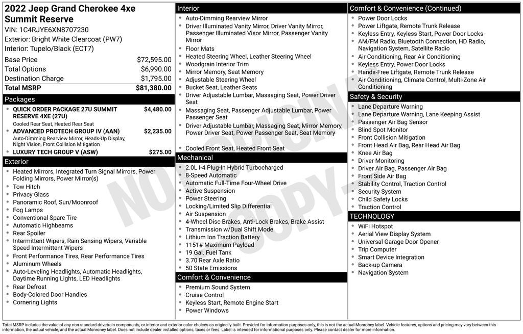 Jeep Grand Cherokee Summit Reserve 4xe 2022 Bright White Clearcoat Newly Detailed, 2.0L I4 DOHC, 4WD, 10 Speakers, 19 Speaker High Performance Audio, 2nd-Row Manual Window Shades, 3.70 Rear Axle Ratio, 4-Wheel Disc Brakes, 950 Watt Amplifier, ABS brakes, Active Noise Control System, Adaptive suspension, Advanced Protech Group IV, Air Conditioning, Alloy wheels, AM/FM radio: SiriusXM with 360L, Anti-whiplash front head restraints, Audio memory, Auto High-beam Headlights, Auto-dimming door mirrors, Auto-dimming Rear-View mirror, Auto-leveling suspension, Automatic temperature control, Brake assist, Bumpers: body-color, Compass, Delay-off headlights, Deluxe Headliner, Driver door bin, Driver vanity mirror, Dual front impact airbags, Dual front side impact airbags, Electronic Stability Control, Four wheel independent suspension, Front anti-roll bar, Front Bucket Seats, Front Center Armrest w/Storage, Front dual zone A/C, Front fog lights, Front Passenger Interactive Display, Front reading lights, Fully automatic headlights, Garage door transmitter, Genuine wood dashboard insert, Genuine wood door panel insert, Heads-Up Display, Heated door mirrors, Heated front seats, Heated rear seats, Heated steering wheel, Heavy Duty Suspension, Illuminated entry, Knee airbag, Leather steering wheel, Low tire pressure warning, Luxury Tech Group V, Memory seat, Nappa Leather Seats, Navigation System, Night Vision/Pedestrian-Animal Detection, Occupant sensing airbag, Outside temperature display, Overhead airbag, Overhead console, Palermo Leather Door Trim, Palermo Leather Seats, Panic alarm, Passenger door bin, Passenger vanity mirror, Power door mirrors, Power driver seat, Power Liftgate, Power moonroof, Power passenger seat, Power steering, Power windows, Quick Order Package 27U Summit Reserve 4xe, Radio data system, Radio: Uconnect 5 Nav w/10.1 Display, Rain sensing wipers, Rear air conditioning, Rear anti-roll bar, Rear dual zone A/C, Rear reading lights, Rear seat center armrest, Rear window defroster, Rear window wiper, Rearview Autodim Digital Display Mirror, Remote keyless entry, Roof rack: rails only, Security system, Speed control, Speed-Sensitive Wipers, Split folding rear seat, Spoiler, Steering wheel memory, Steering wheel mounted audio controls, Summit Reserve, Summit Reserve Badge, Tachometer, Telescoping steering wheel, Tilt steering wheel, Traction control, Trip computer, Turn signal indicator mirrors, Two Tone Paint Group, Variably intermittent wipers, Ventilated front seats, Ventilated Rear Seats, Voltmeter, Wheels: 20 x 8.5 Fully Painted Aluminum Silver, Wheels: 21 x 9 Machined Face/Painted Aluminum, Wireless Charging Pad, 2.0L I4 DOHC, 4WD.