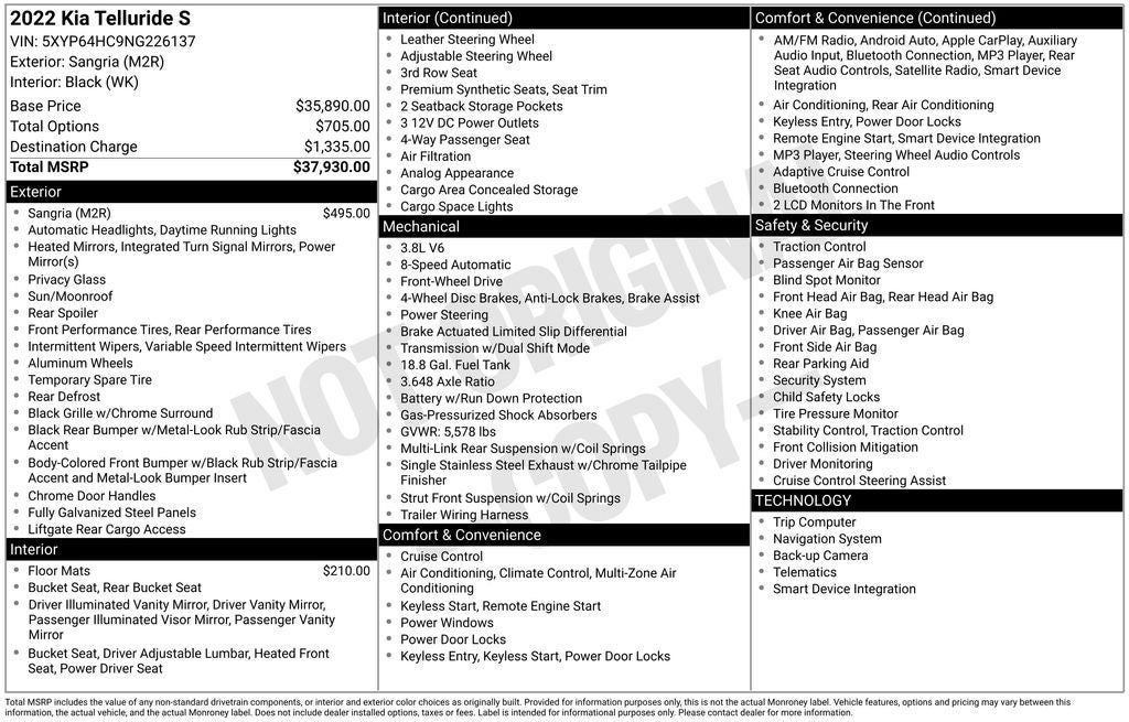 With its exceptional value, uncompromising quality, and comprehensive warranty coverage, this 2022 Kia Telluride S is the perfect choice for those seeking a versatile and reliable SUV. Experience the difference for yourself and schedule a test drive today. We're confident you'll be impressed by the Telluride's remarkable blend of style, technology, and performance.