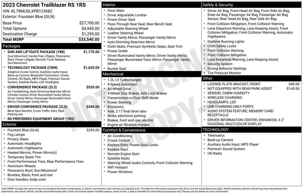 Chevrolet TrailBlazer RS 2023 Fountain Blue Newly Detailed, 1 Type-A & 1 Type-C USB Charging-Only Ports, 120-Volt Power Outlet, 2-Way Adjustable Front Head Restraints, 2-Way Power Driver Lumbar Seat Adjuster, 3.17 Axle Ratio, 4-Way Manual Front Passenger Seat Adjuster, 4-Wheel Disc Brakes, 4.2 Diagonal Multi-Color Driver Info Center, 6 Speakers, 6-Speaker Audio System Feature w/Amplifier, 7 Diagonal Color Touchscreen, 8-Way Power Driver Seat Adjuster, 8 Diagonal Color Touchscreen Display, ABS brakes, Adaptive Cruise Control, Air Conditioning, Alloy wheels, AM/FM radio: SiriusXM, Auto High-beam Headlights, Bose Premium 7-Speaker Audio System Feature, Brake assist, Bumpers: body-color, Cabin Humidity Sensor, Cloth w/Leatherette Seat Trim, Compass, Convenience Package, Delay-off headlights, Driver & Front Passenger Illuminated Vanity Mirrors, Driver Confidence Package, Driver door bin, Driver vanity mirror, Dual front impact airbags, Dual front side impact airbags, Dual-Pane Panoramic Power Sunroof, Electronic Stability Control, Emergency communication system: OnStar and Chevrolet connected services capable, Exterior Parking Camera Rear, Flat-Folding Front Passenger Seatback, Front anti-roll bar, Front Bucket Seats, Front Center Armrest, Front fog lights, Front License Plate Bracket, Front reading lights, Front wheel independent suspension, Fully automatic headlights, Hands-Free Power Programmable Liftgate, HD Radio, HD Rear Vision Camera, Heated door mirrors, Heated Driver & Front Passenger Seats, Heated front seats, Heated Steering Wheel, Heated steering wheel, Illuminated entry, Inside Rear-View Auto-Dimming Mirror, Knee airbag, Lane Change Alert w/Side Blind Zone Alert, Leather Shift Knob, Leather steering wheel, LED Headlamps, Low tire pressure warning, Memory Card Receptacle, Mosaic Black Metallic Two-Tone Roof, Not Equipped w/Rear Park Assist (060), Occupant sensing airbag, Overhead airbag, Overhead console, Panic alarm, Passenger door bin, Passenger vanity mirror, Power door mirrors, Power driver seat, Power steering, Power windows, Preferred Equipment Group 1RS, Radio data system, Radio: Chevrolet Infotainment 3 Plus System, Radio: Chevrolet Infotainment 3 System, Rear Cross Traffic Alert, Rear Park Assist, Rear seat center armrest, Rear side impact airbag, Rear window defroster, Rear window wiper, Remote keyless entry, Ride & Handling Suspension, Security system, Single-Zone Auto Climate Control Air Conditioning, SiriusXM Radio, SiriusXM w/360L, Speed control, Split folding rear seat, Spoiler, Steering wheel mounted audio controls, Sun & Liftgate Package, Tachometer, Technology Package, Telescoping steering wheel, Tilt steering wheel, Traction control, Trip computer, Variably intermittent wipers, Wheels: 18 High Gloss Black Machined Aluminum, Wireless Apple CarPlay/Android Auto, Wireless Charging.