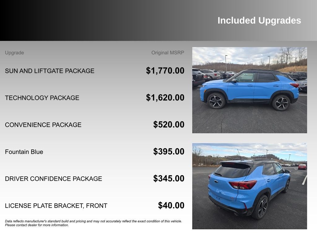Chevrolet TrailBlazer RS 2023 Fountain Blue Newly Detailed, 1 Type-A & 1 Type-C USB Charging-Only Ports, 120-Volt Power Outlet, 2-Way Adjustable Front Head Restraints, 2-Way Power Driver Lumbar Seat Adjuster, 3.17 Axle Ratio, 4-Way Manual Front Passenger Seat Adjuster, 4-Wheel Disc Brakes, 4.2 Diagonal Multi-Color Driver Info Center, 6 Speakers, 6-Speaker Audio System Feature w/Amplifier, 7 Diagonal Color Touchscreen, 8-Way Power Driver Seat Adjuster, 8 Diagonal Color Touchscreen Display, ABS brakes, Adaptive Cruise Control, Air Conditioning, Alloy wheels, AM/FM radio: SiriusXM, Auto High-beam Headlights, Bose Premium 7-Speaker Audio System Feature, Brake assist, Bumpers: body-color, Cabin Humidity Sensor, Cloth w/Leatherette Seat Trim, Compass, Convenience Package, Delay-off headlights, Driver & Front Passenger Illuminated Vanity Mirrors, Driver Confidence Package, Driver door bin, Driver vanity mirror, Dual front impact airbags, Dual front side impact airbags, Dual-Pane Panoramic Power Sunroof, Electronic Stability Control, Emergency communication system: OnStar and Chevrolet connected services capable, Exterior Parking Camera Rear, Flat-Folding Front Passenger Seatback, Front anti-roll bar, Front Bucket Seats, Front Center Armrest, Front fog lights, Front License Plate Bracket, Front reading lights, Front wheel independent suspension, Fully automatic headlights, Hands-Free Power Programmable Liftgate, HD Radio, HD Rear Vision Camera, Heated door mirrors, Heated Driver & Front Passenger Seats, Heated front seats, Heated Steering Wheel, Heated steering wheel, Illuminated entry, Inside Rear-View Auto-Dimming Mirror, Knee airbag, Lane Change Alert w/Side Blind Zone Alert, Leather Shift Knob, Leather steering wheel, LED Headlamps, Low tire pressure warning, Memory Card Receptacle, Mosaic Black Metallic Two-Tone Roof, Not Equipped w/Rear Park Assist (060), Occupant sensing airbag, Overhead airbag, Overhead console, Panic alarm, Passenger door bin, Passenger vanity mirror, Power door mirrors, Power driver seat, Power steering, Power windows, Preferred Equipment Group 1RS, Radio data system, Radio: Chevrolet Infotainment 3 Plus System, Radio: Chevrolet Infotainment 3 System, Rear Cross Traffic Alert, Rear Park Assist, Rear seat center armrest, Rear side impact airbag, Rear window defroster, Rear window wiper, Remote keyless entry, Ride & Handling Suspension, Security system, Single-Zone Auto Climate Control Air Conditioning, SiriusXM Radio, SiriusXM w/360L, Speed control, Split folding rear seat, Spoiler, Steering wheel mounted audio controls, Sun & Liftgate Package, Tachometer, Technology Package, Telescoping steering wheel, Tilt steering wheel, Traction control, Trip computer, Variably intermittent wipers, Wheels: 18 High Gloss Black Machined Aluminum, Wireless Apple CarPlay/Android Auto, Wireless Charging.