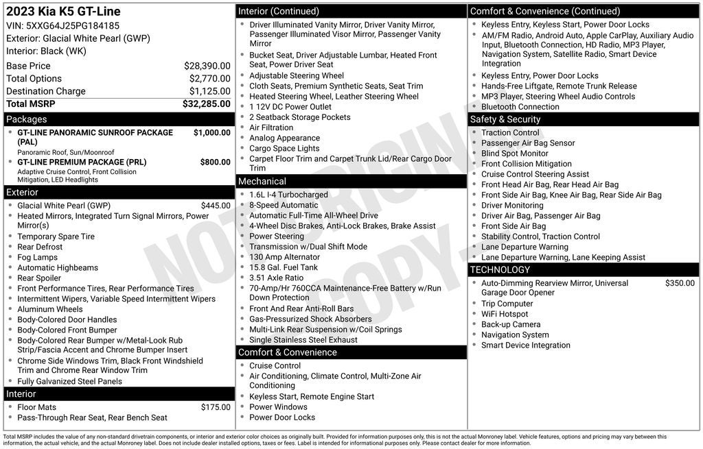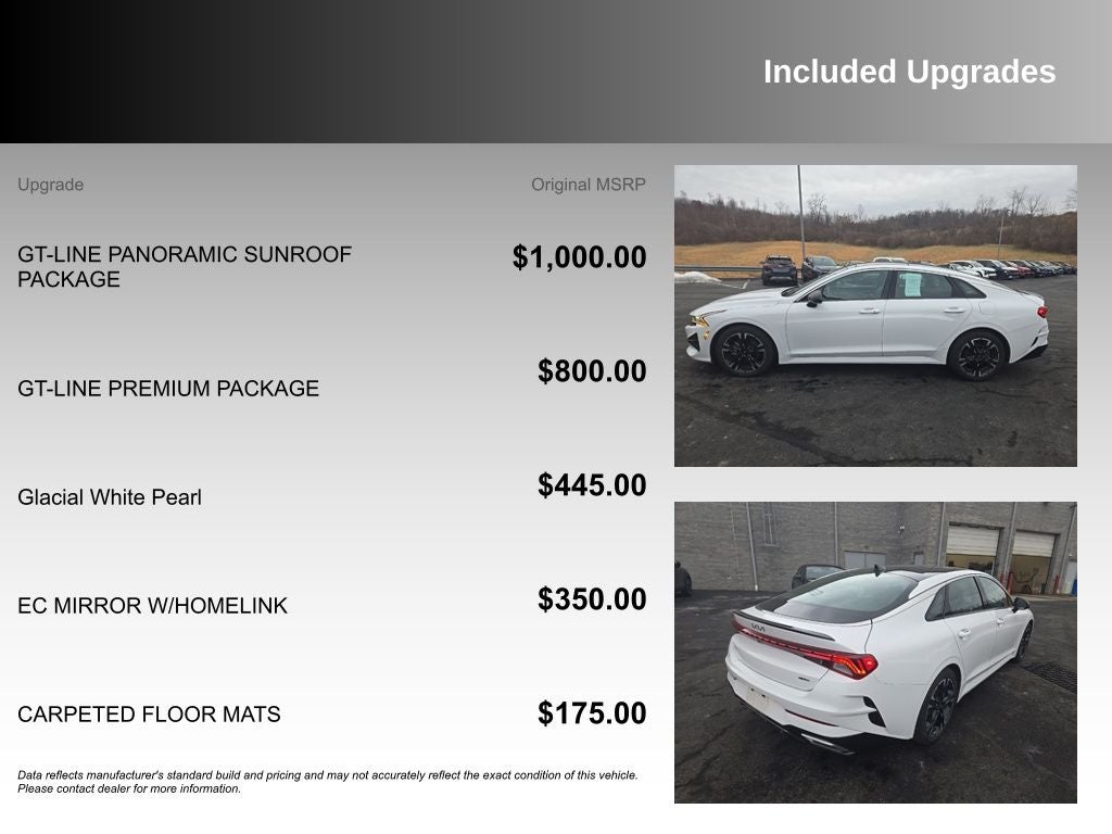 Powered by a potent 1.6L I4 DGI Turbocharged engine, the K5 GT-Line delivers an exhilarating 180 horsepower, seamlessly channeled through an 8-speed automatic transmission and all-wheel-drive system. With an impressive 25 city/33 highway MPG, this sedan strikes the perfect balance between performance and efficiency.
