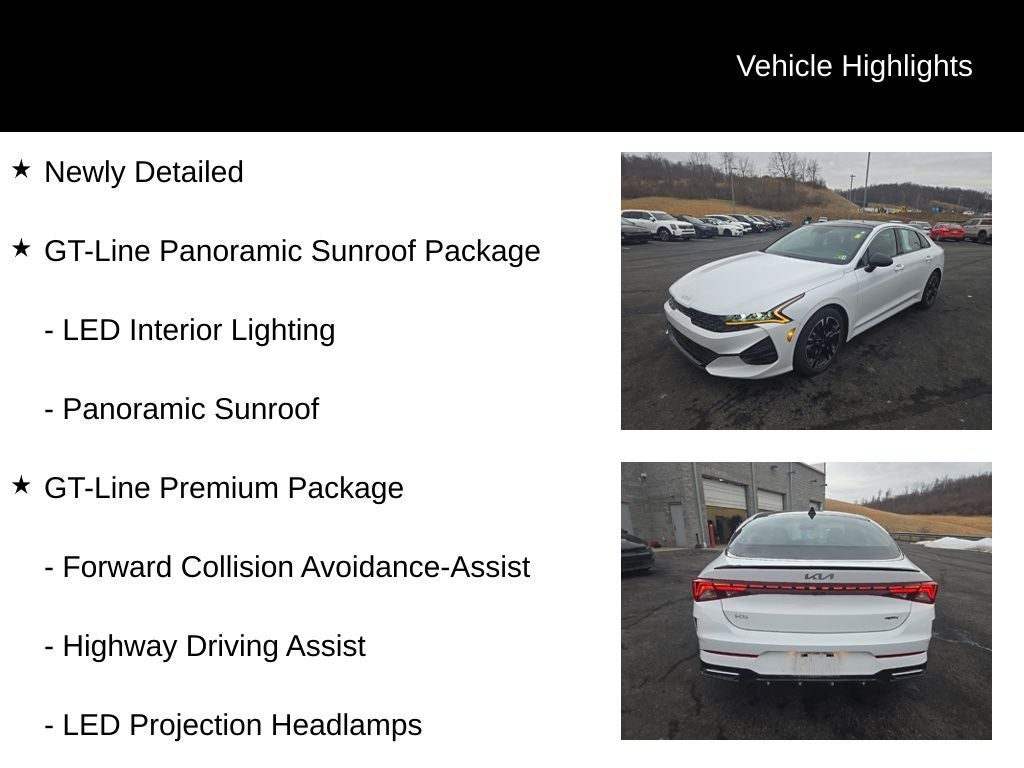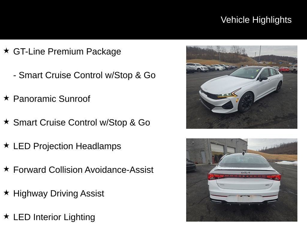 Whether you're commuting through the city or embarking on a weekend getaway, the 2023 Kia K5 GT-Line is the perfect companion. Experience the pinnacle of midsize sedan design, performance, and technology by scheduling a test drive today. We're confident you'll be impressed by this exceptional vehicle.