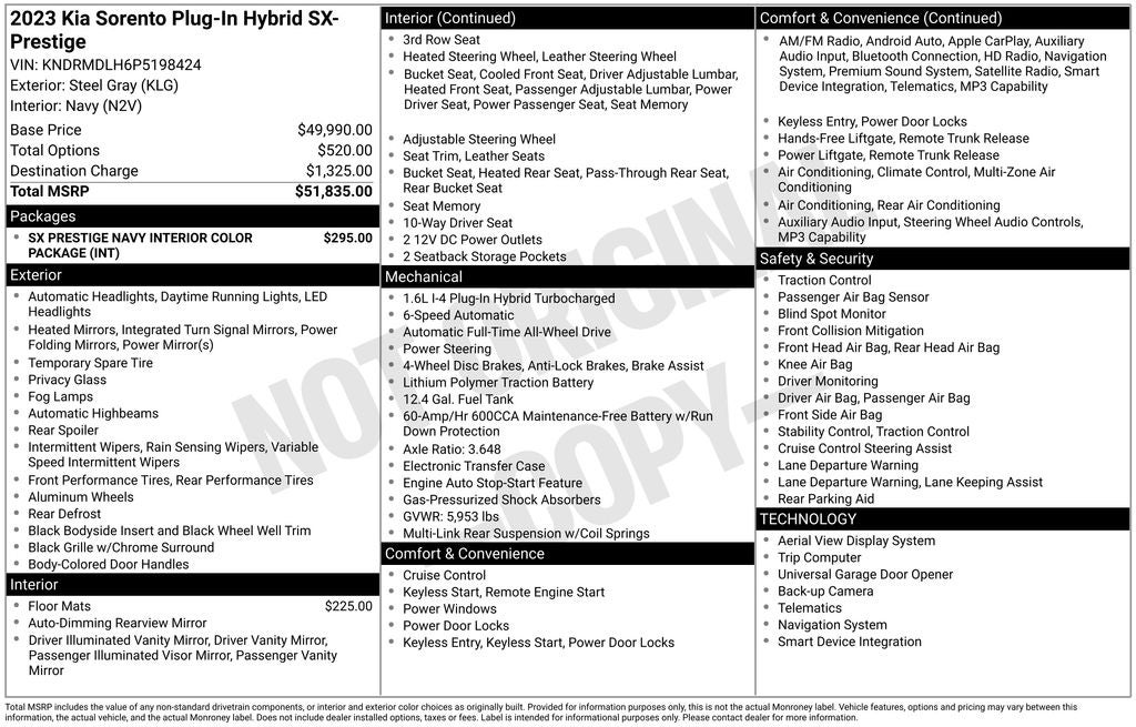 Kia Sorento Plug-In Hybrid SX Prestige 2023 Steel Gray Certified. Newly Detailed, Kia Certified Pre-Owned Certified, 1.6L I4 DGI Hybrid Turbocharged DOHC 16V LEV3-ULEV70, Navy Leather Seat Trim, SX Prestige Navy Interior Color Package, 12 Speakers, 3rd row seats: split-bench, 4-Wheel Disc Brakes, ABS brakes, Air Conditioning, Alloy wheels, AM/FM radio: SiriusXM, Apple CarPlay & Android Auto, Auto High-beam Headlights, Auto-dimming Rear-View mirror, Automatic temperature control, Axle Ratio: 3.648, Brake assist, Bumpers: body-color, Carpet Floor Mats, Delay-off headlights, Driver door bin, Driver vanity mirror, Dual front impact airbags, Dual front side impact airbags, Electronic Stability Control, Emergency communication system, Four wheel independent suspension, Front anti-roll bar, Front Bucket Seats, Front Center Armrest, Front dual zone A/C, Front fog lights, Front reading lights, Fully automatic headlights, Garage door transmitter: HomeLink, Genuine Perforated Leather Seat Trim, Heated & Ventilated Front Bucket Seats, Heated door mirrors, Heated front seats, Heated rear seats, Heated steering wheel, Illuminated entry, Knee airbag, Leather steering wheel, Low tire pressure warning, Memory seat, Navigation System, Occupant sensing airbag, Outside temperature display, Overhead airbag, Overhead console, Panic alarm, Passenger door bin, Passenger vanity mirror, Power door mirrors, Power driver seat, Power Liftgate, Power passenger seat, Power steering, Power windows, Radio data system, Radio: AM/FM/HD Radio/SiriusXM Audio System, Rain sensing wipers, Rear air conditioning, Rear anti-roll bar, Rear reading lights, Rear window defroster, Rear window wiper, Remote keyless entry, Roof rack: rails only, Security system, Smart Key w/ Push Button and Remote Start, Speed control, Speed-sensing steering, Split folding rear seat, Spoiler, Steering wheel mounted audio controls, Tachometer, Telescoping steering wheel, Tilt steering wheel, Traction control, Trip computer, Turn signal indicator mirrors, Variably intermittent wipers, Ventilated front seats, Wheels: 19 Machine-Finished Alloy, 1.6L I4 DGI Hybrid Turbocharged DOHC 16V LEV3-ULEV70, Navy Leather Seat Trim, SX Prestige Navy Interior Color Package.