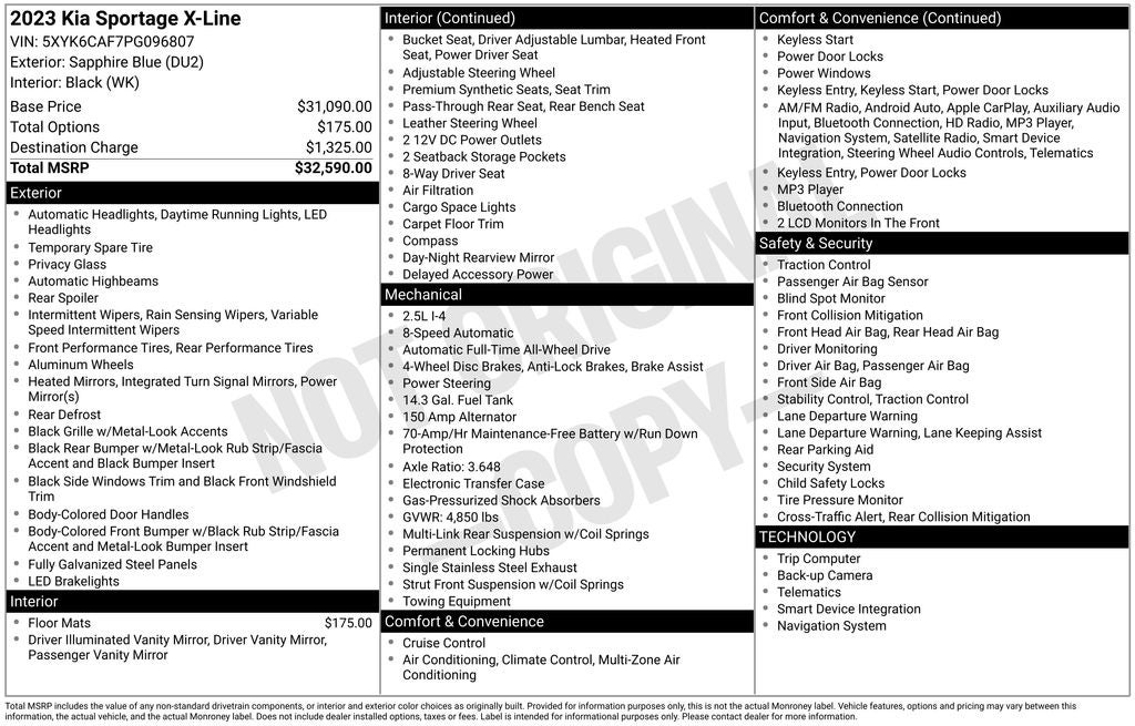 Kia Sportage X-Line 2023 Sapphire Blue Newly Detailed, AWD, 4-Wheel Disc Brakes, 6 Speakers, ABS brakes, Air Conditioning, Alloy wheels, AM/FM radio: SiriusXM, Apple CarPlay & Android Auto, Auto High-beam Headlights, Automatic temperature control, Axle Ratio: 3.648, Brake assist, Bumpers: body-color, Carpet Floor Mats X-Line, Compass, Delay-off headlights, Driver door bin, Driver vanity mirror, Dual front impact airbags, Dual front side impact airbags, Electronic Stability Control, Emergency communication system, Four wheel independent suspension, Front anti-roll bar, Front Bucket Seats, Front Center Armrest, Front dual zone A/C, Fully automatic headlights, harman/kardon® Speakers, Heated door mirrors, Heated Front Bucket Seats, Heated front seats, Illuminated entry, Leather Shift Knob, Leather steering wheel, Low tire pressure warning, Navigation System, Occupant sensing airbag, Outside temperature display, Overhead airbag, Overhead console, Panic alarm, Passenger door bin, Passenger vanity mirror, Power door mirrors, Power driver seat, Power steering, Power windows, Premium Leatherette Seat Trim, Radio: AM/FM/HD Audio System, Rain sensing wipers, Rear anti-roll bar, Rear seat center armrest, Rear window defroster, Rear window wiper, Remote keyless entry, Security system, Speed control, Speed-sensing steering, Split folding rear seat, Spoiler, Steering wheel mounted audio controls, Tachometer, Telescoping steering wheel, Tilt steering wheel, Traction control, Trip computer, Turn signal indicator mirrors, Variably intermittent wipers, Wheels: 19 Gloss Black Alloy, AWD.