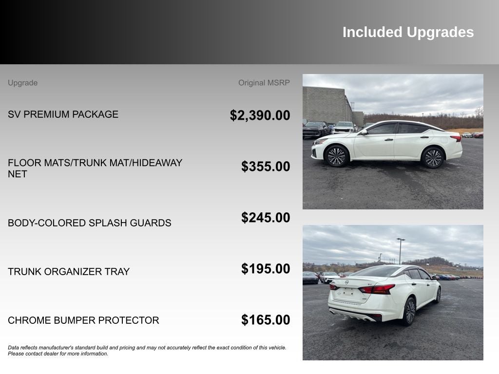 Nissan Altima 2.5 SV 2023 Pearl White Tricoat Newly Detailed, CVT with Xtronic, 17 Machined Alloy Wheels, 4-Wheel Disc Brakes, 6 Speakers, ABS brakes, Active Ride Control (ARC), Air Conditioning, Alloy wheels, AM/FM radio: SiriusXM, Auto High-beam Headlights, Blind Spot Warning, Body-Colored Outside Mirrors, Body-Colored Splash Guards, Brake assist, Bumpers: body-color, Chrome Bumper Protector, Cloth Seat Trim, Delay-off headlights, Driver door bin, Driver vanity mirror, Dual front impact airbags, Dual front side impact airbags, Electronic Parking Brake w/Auto-Hold, Electronic Stability Control, Exhaust Finishers, Floor Mats/Trunk Mat/Hideaway Net, Four wheel independent suspension, Front anti-roll bar, Front Bucket Seats, Front Center Armrest, Front reading lights, Fully automatic headlights, Heated Front Seats, Illuminated entry, Intelligent Cruise Control w/Full Spd Range & Hold, Intelligent Lane Intervention (I-LI), Intelligent Trace Control (I-TC), Knee airbag, Leather Shift Knob, Leather Steering Wheel, Low tire pressure warning, NissanConnect, NissanConnect featuring Apple CarPlay and Android Auto, Occupant sensing airbag, Outside temperature display, Overhead airbag, Overhead console, Panic alarm, Passenger door bin, Passenger vanity mirror, Power door mirrors, Power driver seat, Power steering, Power windows, Premium Interior Finishers, ProPILOT Assist, Radio data system, Radio: AM/FM Audio System, Rear anti-roll bar, Rear Parking Sensors, Rear reading lights, Rear seat center armrest, Rear side impact airbag, Rear window defroster, Remote keyless entry, Security system, Single Panel Moonroof, Speed control, Speed-sensing steering, Speed-Sensitive Wipers, Split folding rear seat, Steering Assist, Steering wheel mounted audio controls, SV Premium Package, Tachometer, Telescoping steering wheel, Tilt steering wheel, Traction control, Traffic Sign Recognition, Trip computer, Trunk Organizer Tray, Variably intermittent wipers, CVT with Xtronic.