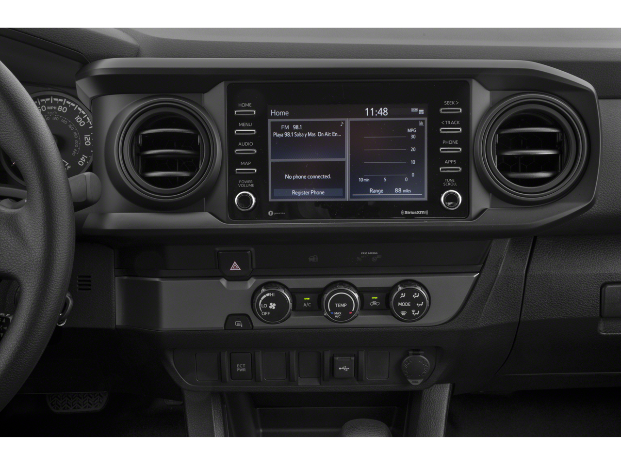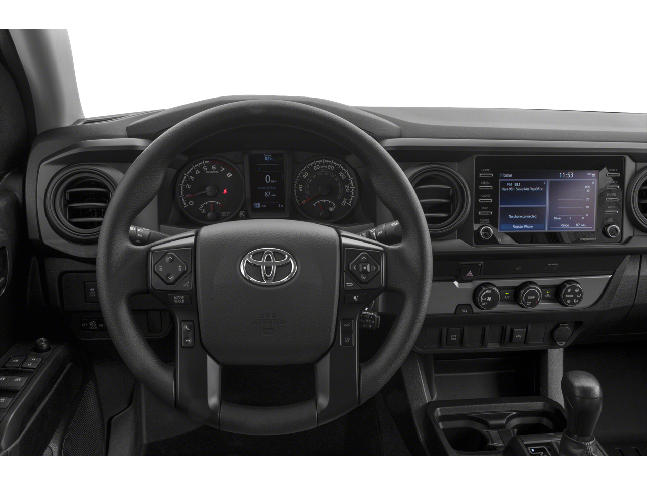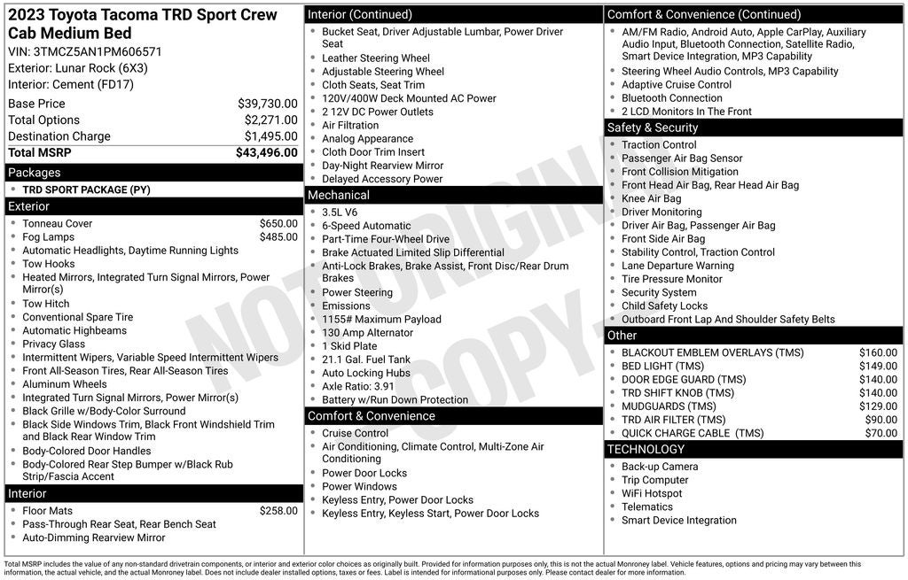 Toyota Tacoma 2023 Newly Detailed, 4WD, 120V/400W Deck Mounted AC Power, ABS brakes, Air Conditioning, Alloy wheels, AM/FM radio: SiriusXM, Anti-whiplash front head restraints, Apple CarPlay/Android Auto, Auto High-beam Headlights, Auto-dimming Rear-View mirror, Auto-Dimming Rearview Mirror w/HomeLink, Automatic temperature control, Axle Ratio: 3.91, Blind Spot Monitor w/Rear Cross Traffic Alert, Brake assist, Bumpers: body-color, Driver door bin, Dual front impact airbags, Dual front side impact airbags, Electronic Stability Control, Emergency communication system: Safety Connect (1-year trial), Engine Immobilizer, Exterior Parking Camera Rear, Front anti-roll bar, Front Bucket Seats, Front Center Armrest, Front Door Smart Key System w/Push Button Start, Front dual zone A/C, Front fog lights, Front reading lights, Front wheel independent suspension, Garage door transmitter: HomeLink, Heated door mirrors, Illuminated entry, Knee airbag, Leather Shift Knob, Low tire pressure warning, Occupant sensing airbag, Outside temperature display, Overhead airbag, Overhead console, Panic alarm, Passenger door bin, Power door mirrors, Power driver seat, Power Sliding Rear Window w/Privacy Glass, Power steering, Power windows, Radio: Premium JBL Audio w/Dynamic Navigation, Rear Parking Assist Sonar, Rear step bumper, Remote keyless entry, Security system, Speed control, Speed-sensing steering, Split folding rear seat, Steering wheel mounted audio controls, Tachometer, Telescoping steering wheel, Tilt steering wheel, Traction control, Trip computer, Turn signal indicator mirrors, Variably intermittent wipers, 4WD.