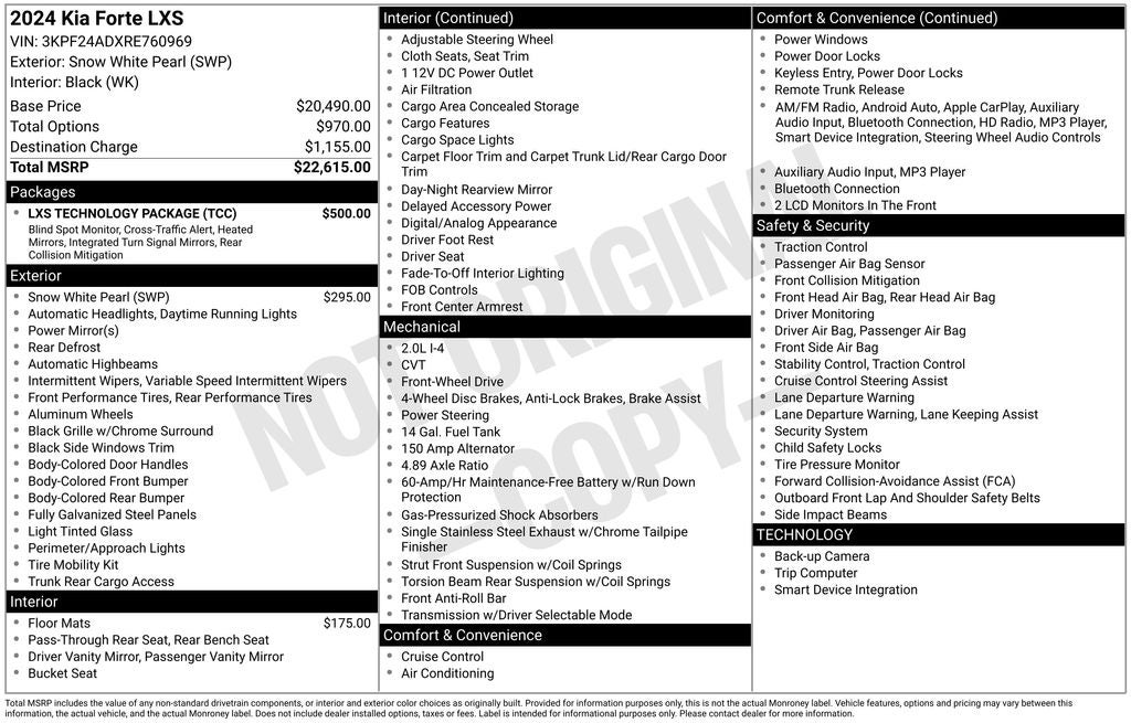 Kia Forte LXS 2024 Snow White Pearl Newly Detailed, 4 Speakers, 4-Wheel Disc Brakes, ABS brakes, Air Conditioning, AM/FM radio, Apple CarPlay & Android Auto, Auto High-beam Headlights, Brake assist, Bumpers: body-color, Carpet Floor Mats, Cloth Seat Trim, Delay-off headlights, Driver door bin, Driver vanity mirror, Dual front impact airbags, Dual front side impact airbags, Electronic Stability Control, Exterior Parking Camera Rear, Front anti-roll bar, Front Bucket Seats, Front Center Armrest, Front reading lights, Front wheel independent suspension, Fully automatic headlights, Illuminated entry, Low tire pressure warning, Occupant sensing airbag, Outside temperature display, Overhead airbag, Overhead console, Panic alarm, Passenger door bin, Passenger vanity mirror, Power door mirrors, Power steering, Power windows, Radio data system, Radio: 8 Display Audio, Rear window defroster, Remote keyless entry, Security system, Speed control, Steering wheel mounted audio controls, Tachometer, Telescoping steering wheel, Tilt steering wheel, Traction control, Trip computer, Variably intermittent wipers.
