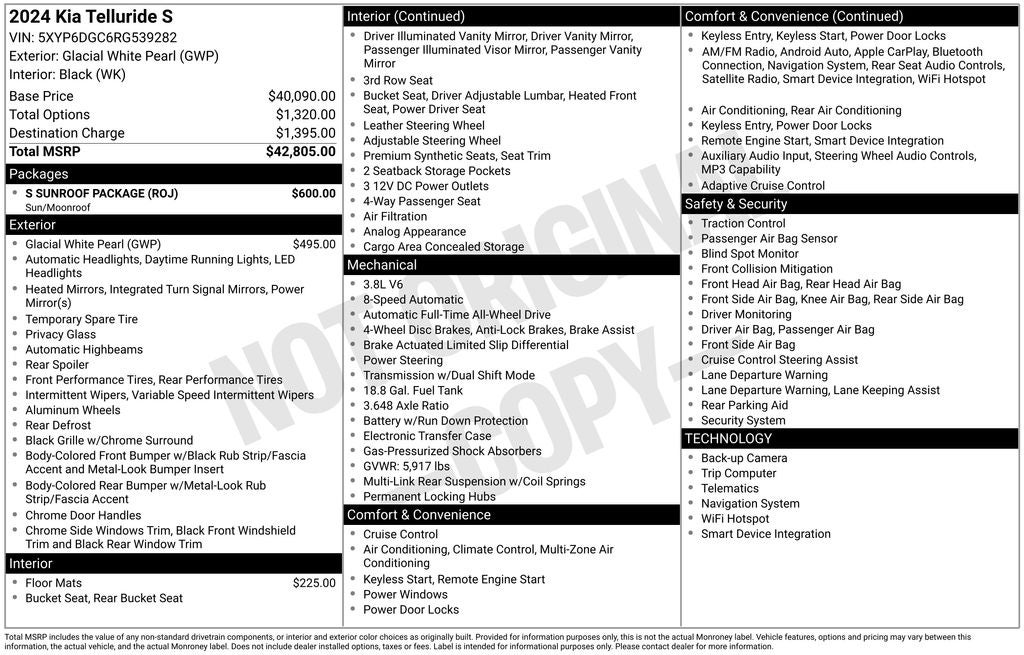Kia Telluride S 2024 Glacial White Pearl Newly Detailed, 3.648 Axle Ratio, 3rd row seats: split-bench, 4-Wheel Disc Brakes, 6 Speakers, ABS brakes, Air Conditioning, Alloy wheels, AM/FM radio: SiriusXM, Apple CarPlay & Android Auto, Auto High-beam Headlights, Automatic temperature control, Brake assist, Bumpers: body-color, Carpet Floor Mats, Delay-off headlights, Driver door bin, Driver vanity mirror, Dual front impact airbags, Dual front side impact airbags, Electronic Stability Control, Emergency communication system: 911 Connect, Exterior Parking Camera Rear, Four wheel independent suspension, Front anti-roll bar, Front Bucket Seats, Front Center Armrest, Front dual zone A/C, Front reading lights, Fully automatic headlights, Heated door mirrors, Heated Front Bucket Seats, Heated front seats, Illuminated entry, Knee airbag, Leather Shift Knob, Leather steering wheel, Low tire pressure warning, Navigation System, Occupant sensing airbag, Outside temperature display, Overhead airbag, Overhead console, Panic alarm, Passenger door bin, Passenger vanity mirror, Power door mirrors, Power driver seat, Power steering, Power Sunroof w/Sunshade, Power windows, Radio data system, Radio: AM/FM Display Audio System, Rear air conditioning, Rear anti-roll bar, Rear audio controls, Rear reading lights, Rear side impact airbag, Rear window defroster, Rear window wiper, Reclining 3rd row seat, Remote keyless entry, Roof rack: rails only, S Sunroof Package, Security system, Smart Key w/ Push Button and Remote Start, Speed control, Speed-sensing steering, Split folding rear seat, Spoiler, Steering wheel mounted audio controls, SynTex Synthetic Leather Seat Trim, Tachometer, Telescoping steering wheel, Tilt steering wheel, Traction control, Trip computer, Turn signal indicator mirrors, Variably intermittent wipers, Wheels: 20 x 7.5 Black Finish.